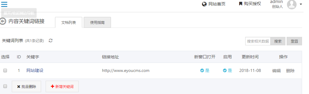 3、首先进入内链插件管理界面,然后设置好自己需要优化的关键词以及其链接,即可自动的设置全站文档内容关键词链接。